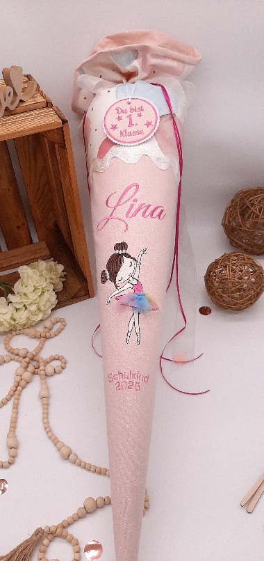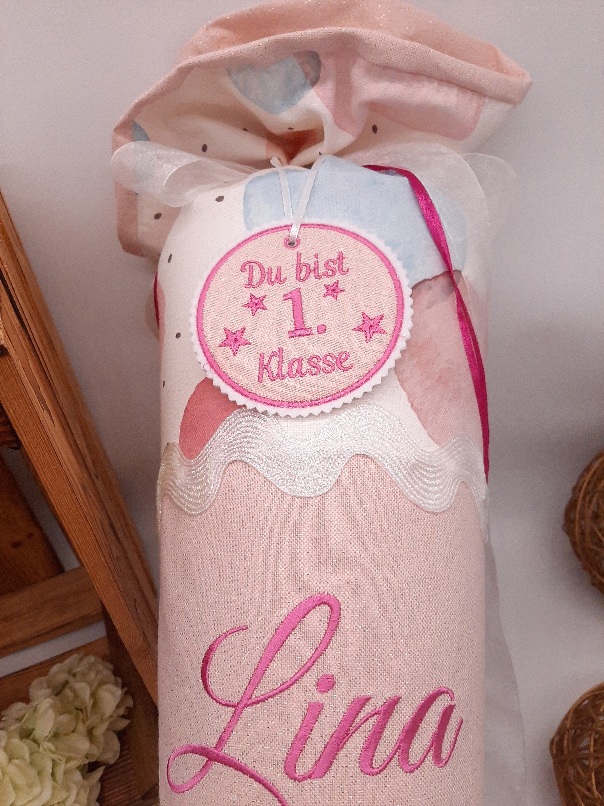 Die Schultüte wird mit dem Namen des Kindes und z.B. Schulkind 202* bestickt.