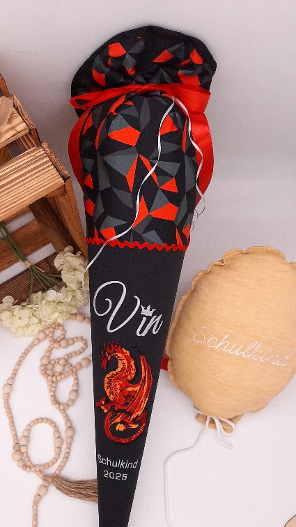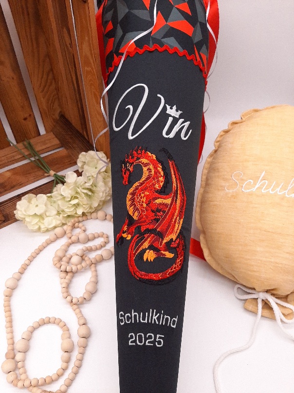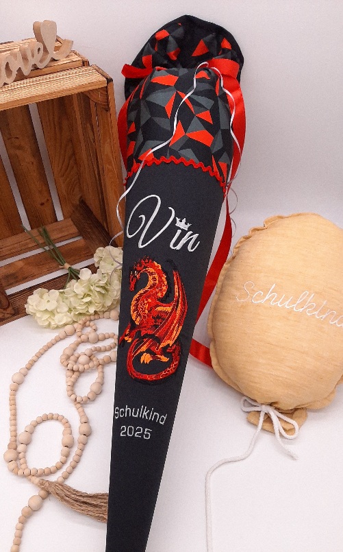 Die Schultüte wird mit dem Namen des Kindes und z.B. Schulkind 202* bestickt.