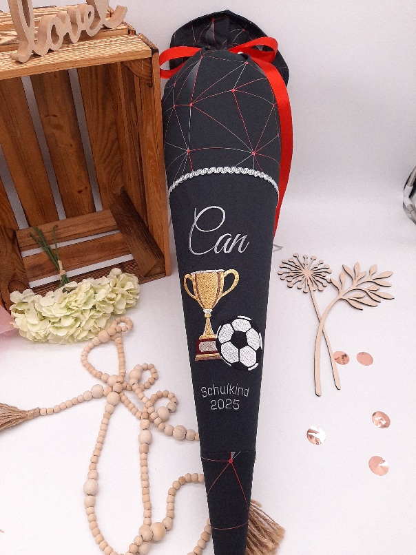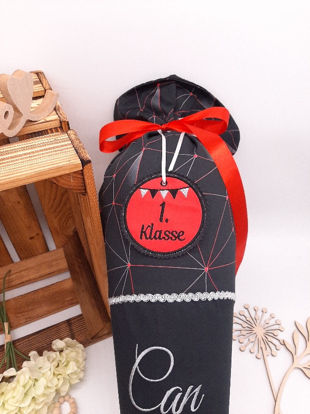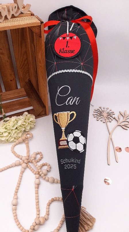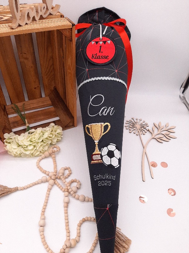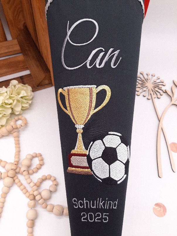Die Schultüte wird mit dem Namen des Kindes und z.B. Schulkind 202* bestickt.