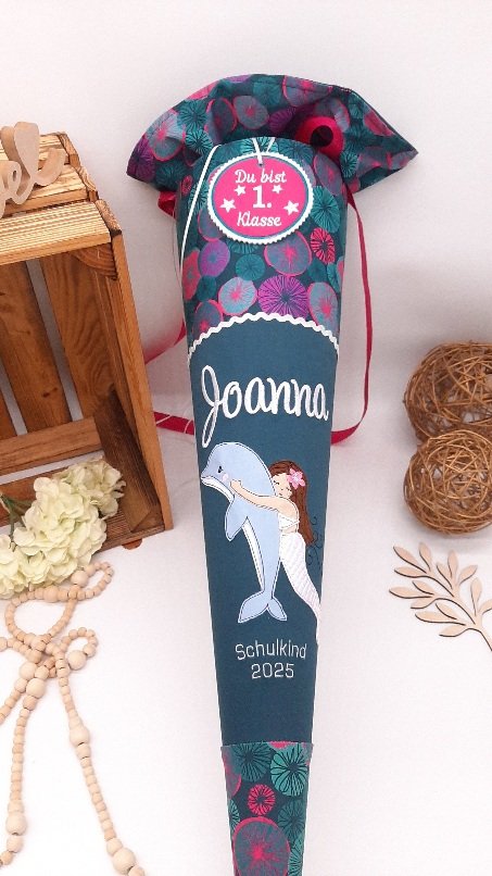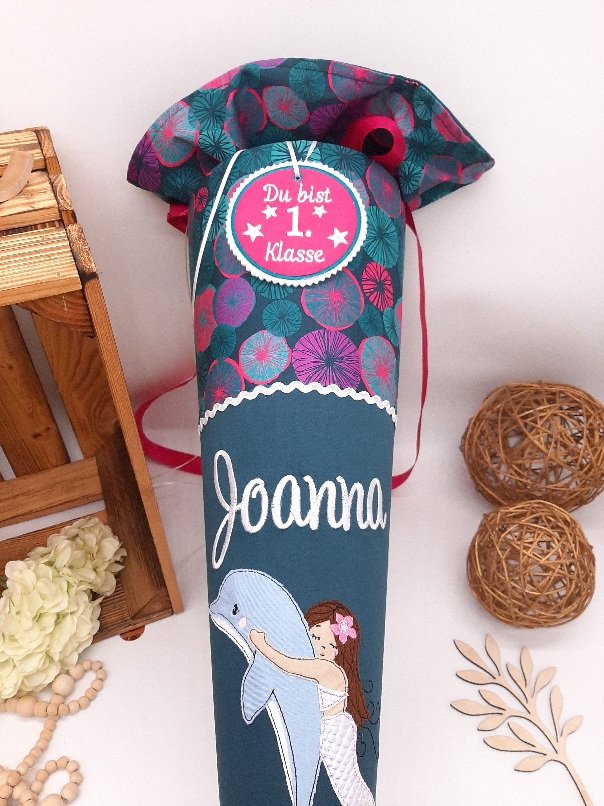 Schultüte Marmaid / Meerjungfrau mit Delfin, u.a. passend zum Ergobag Korallbär, Zuckertüte aus Stoff
