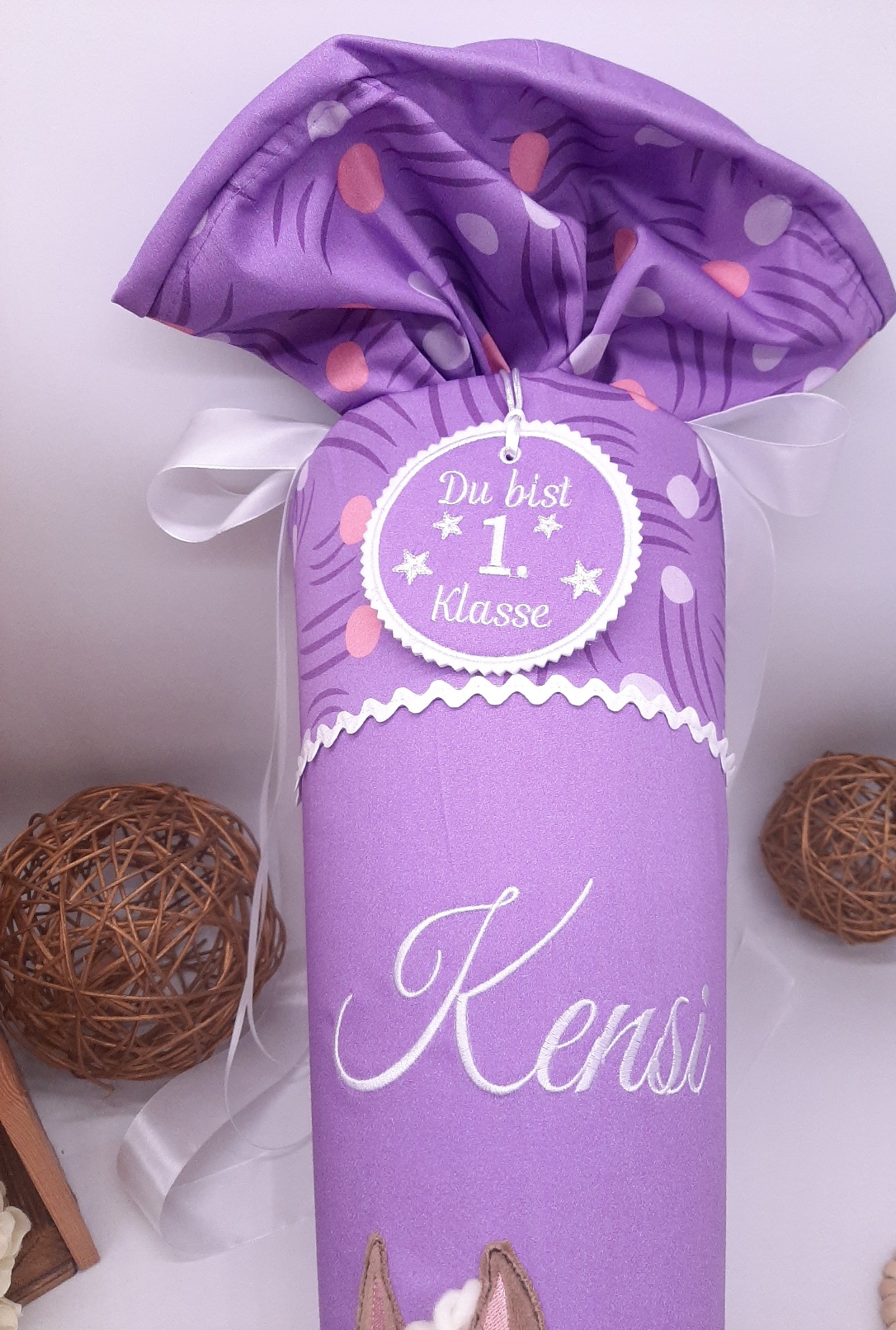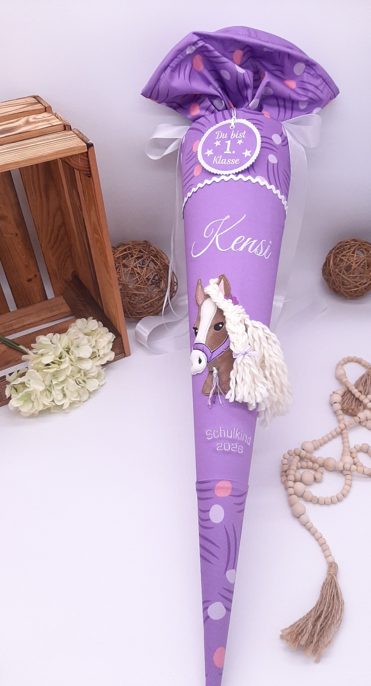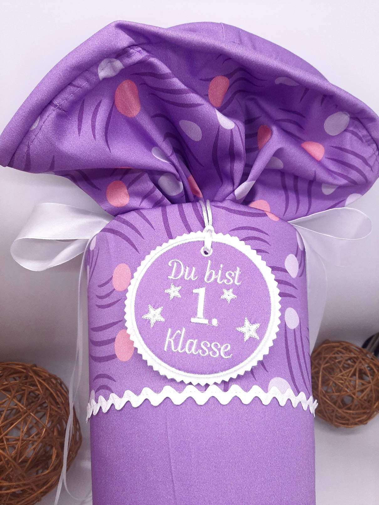 Hier bekommtst du eine klassisch runde Schultüte (Papprohlinggröße 70cm oder 85cm hoch) mit einer tollen Stickerei.