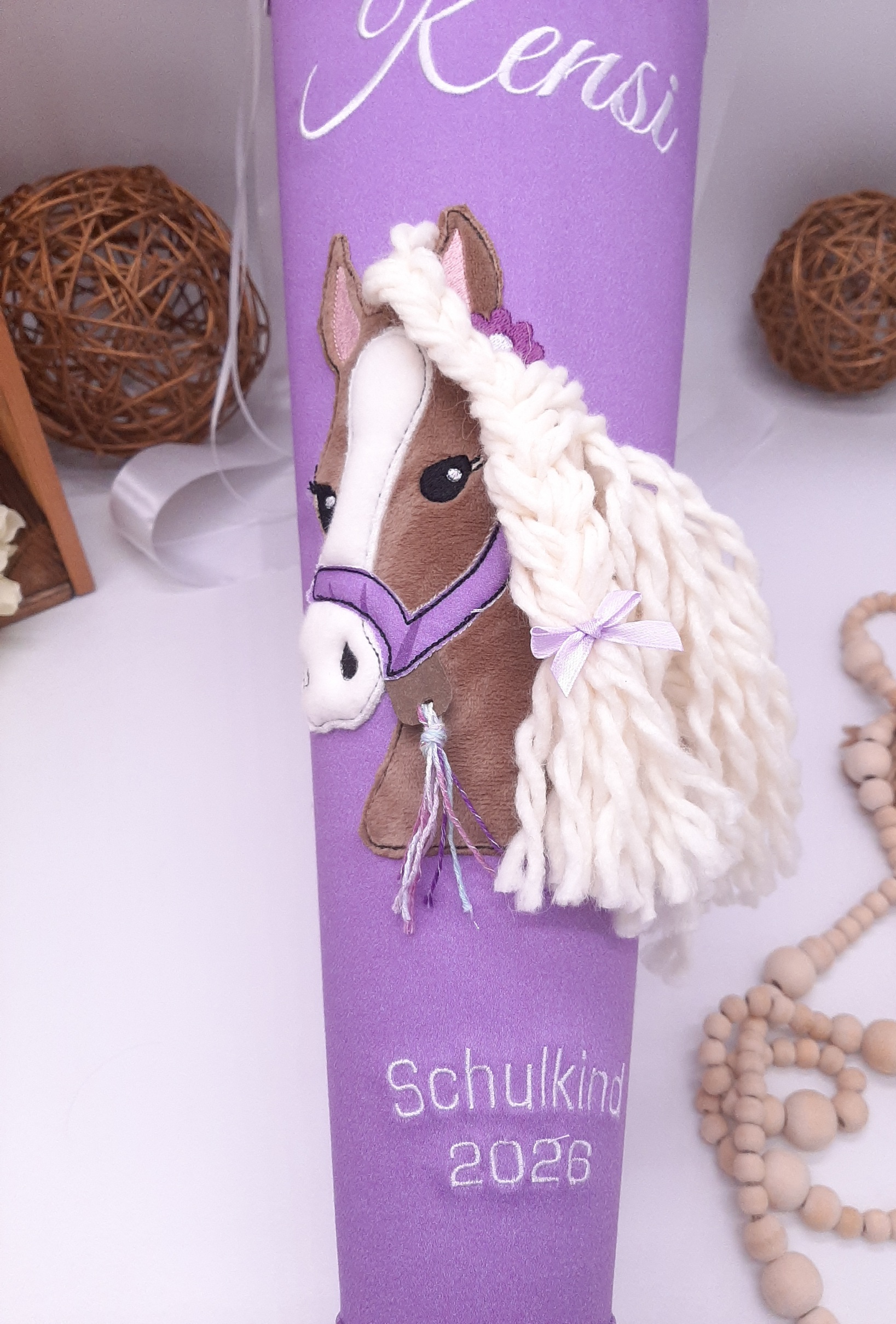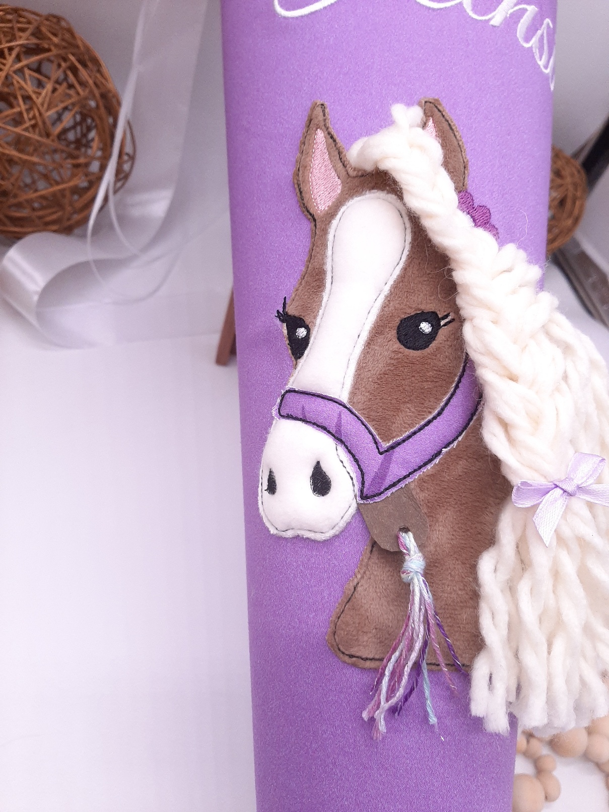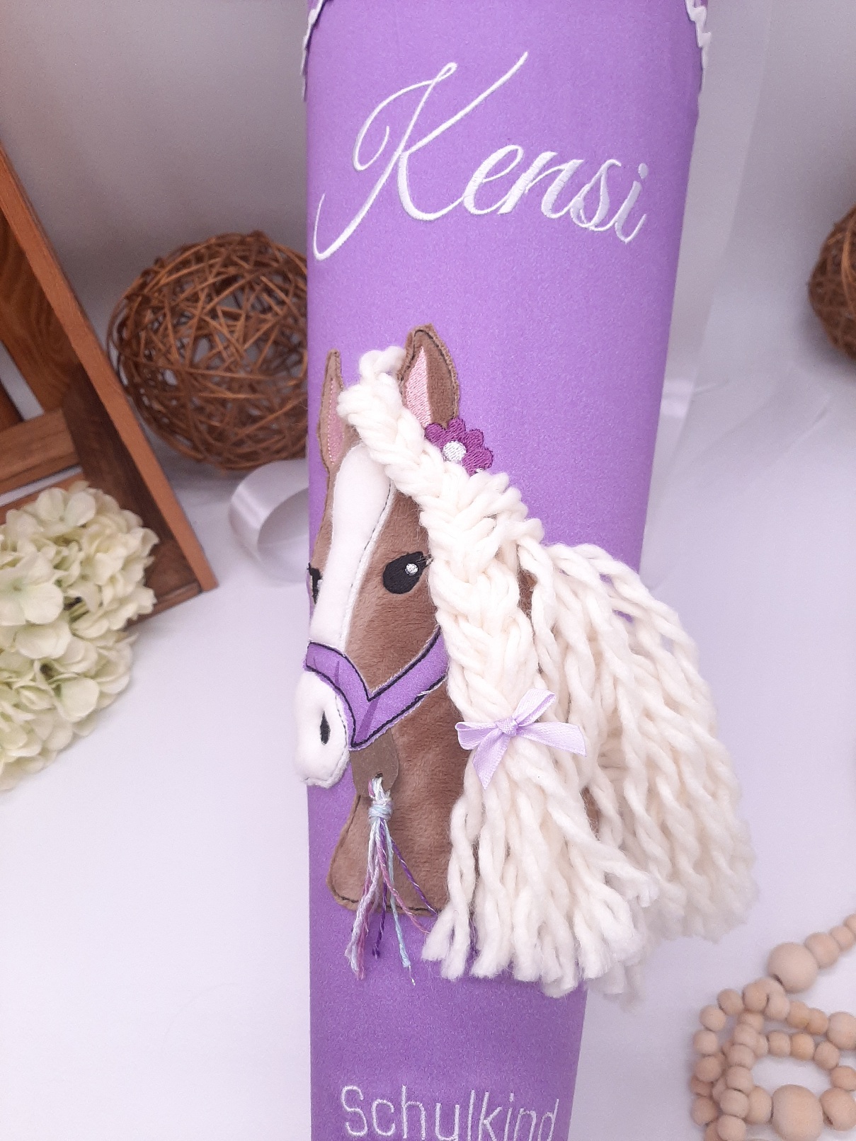 Hier bekommtst du eine klassisch runde Schultüte (Papprohlinggröße 70cm oder 85cm hoch) mit einer tollen Stickerei.