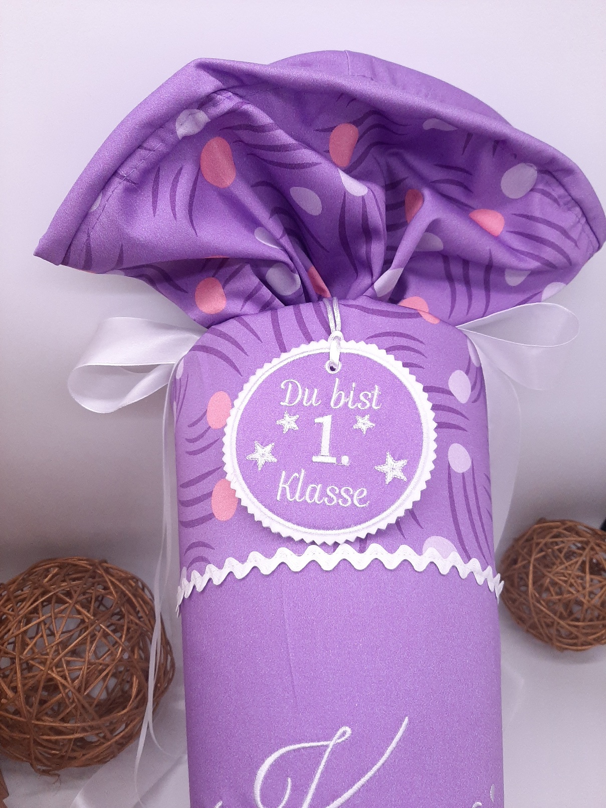 Die Schultüte wird mit dem Namen des Kindes und z.B. Schulkind 202* bestickt.