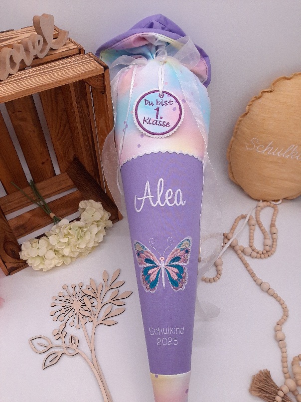 Die Schultüte wird mit dem Namen des Kindes und z.B. Schulkind 202* bestickt.